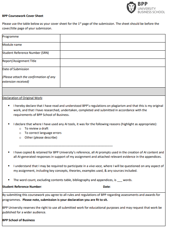 - Cover page (BPP University Administration Cover Sheet)